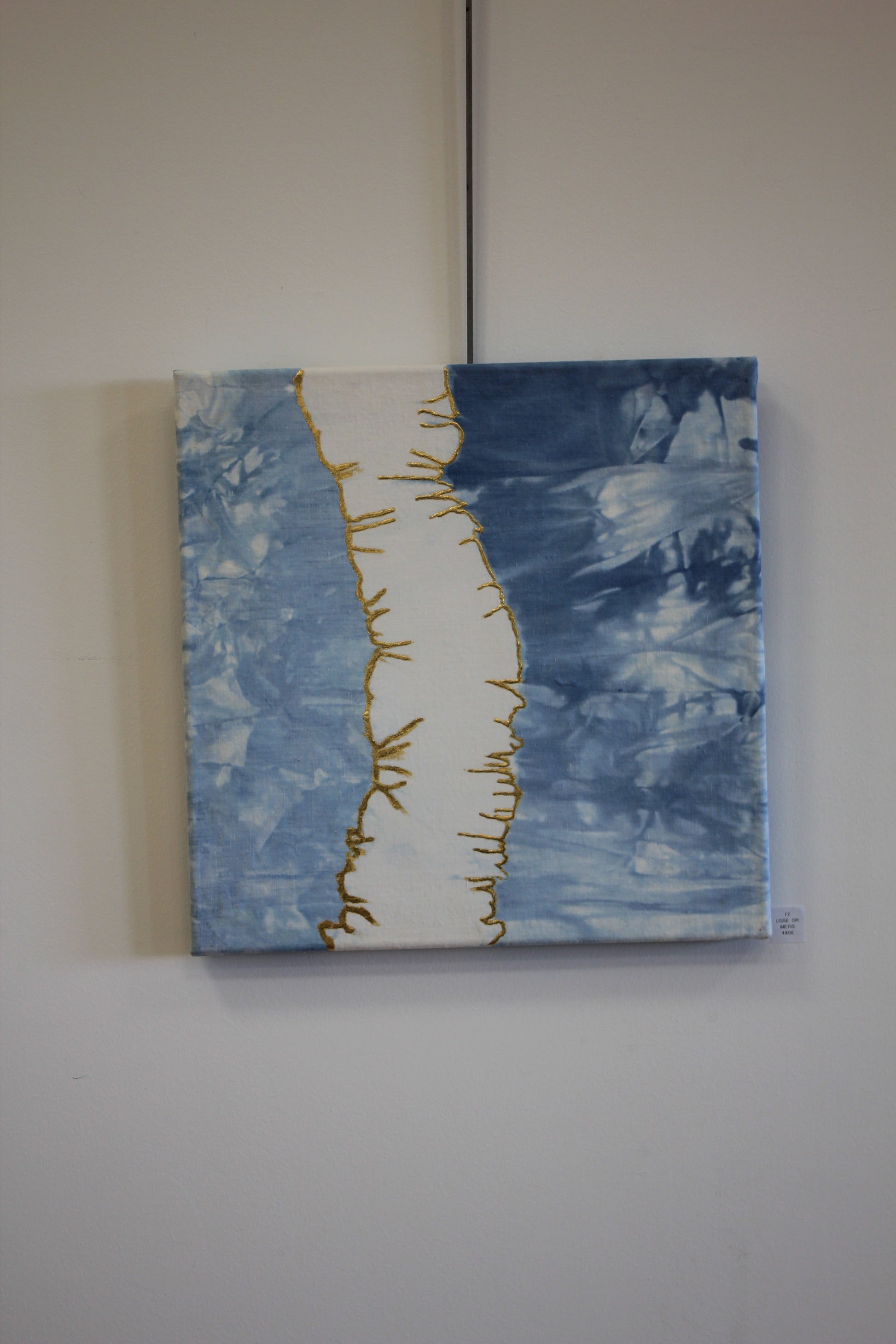 Rivière, teinture au bleu de pastel affinée à la feuille d'or fin.