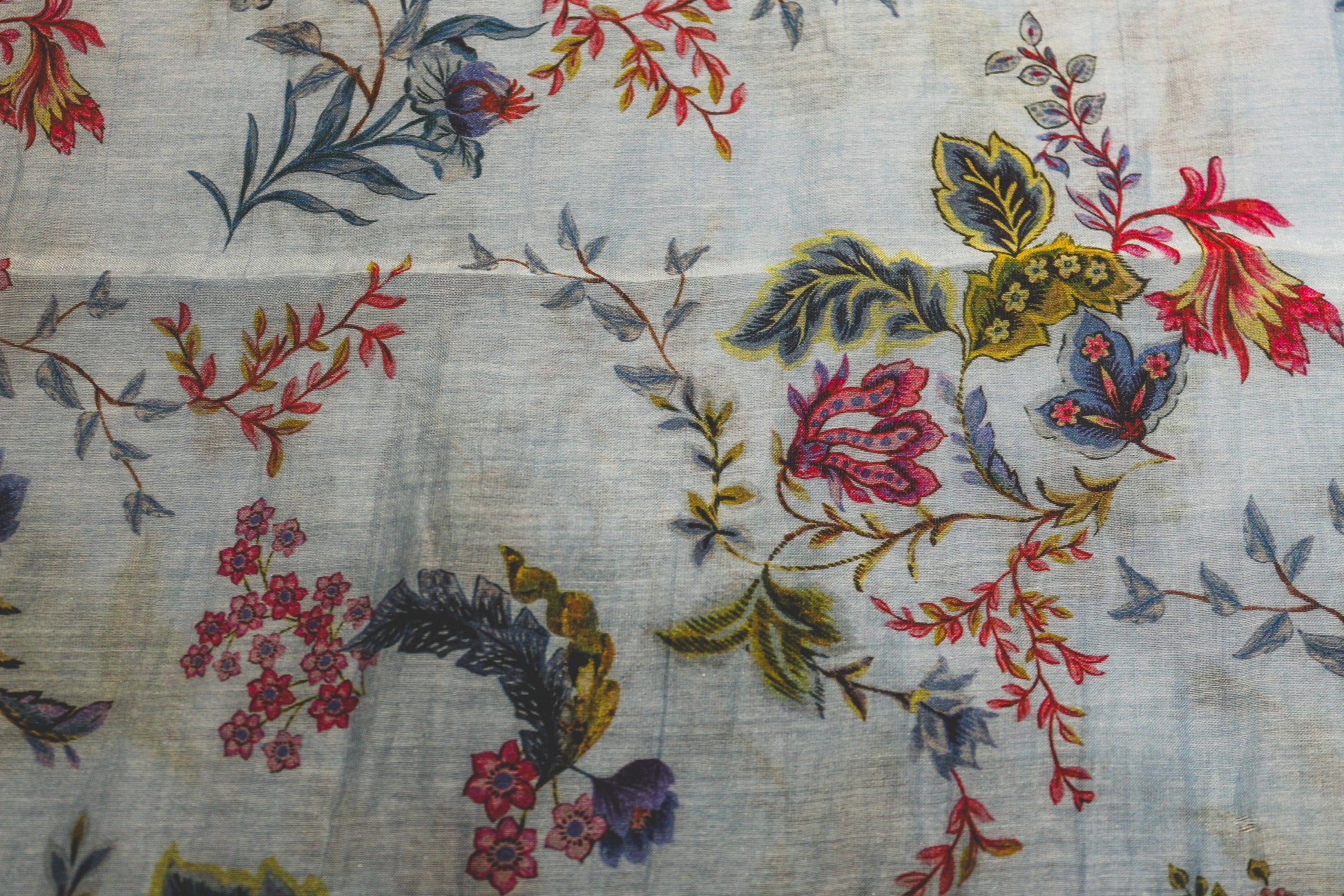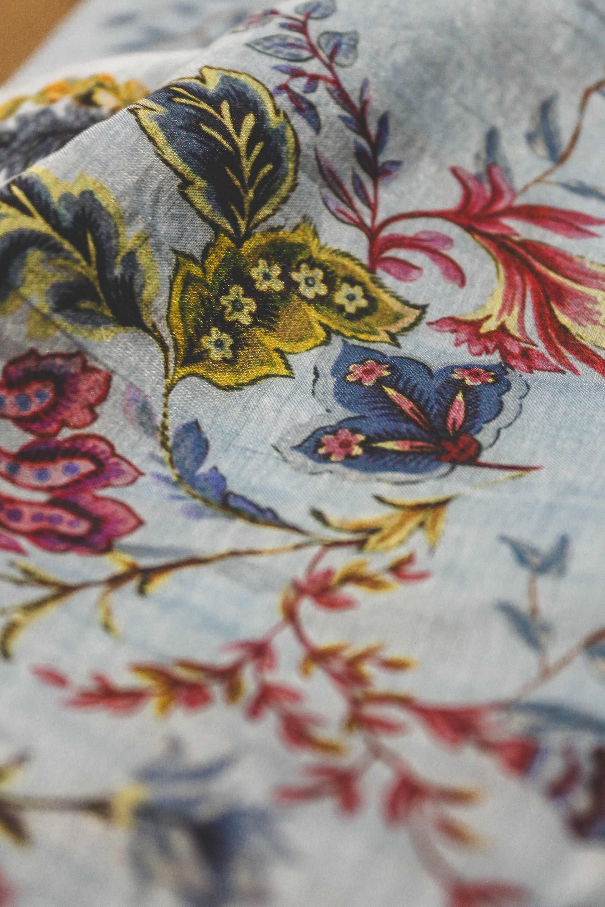 Teinté au bleu de pastel dans notre atelier toulousain, il révèle un fond bleu subtil qui fait vibrer chaque détail du dessin : fleurs éclatantes, feuillages colorés et élégance intemporelle.