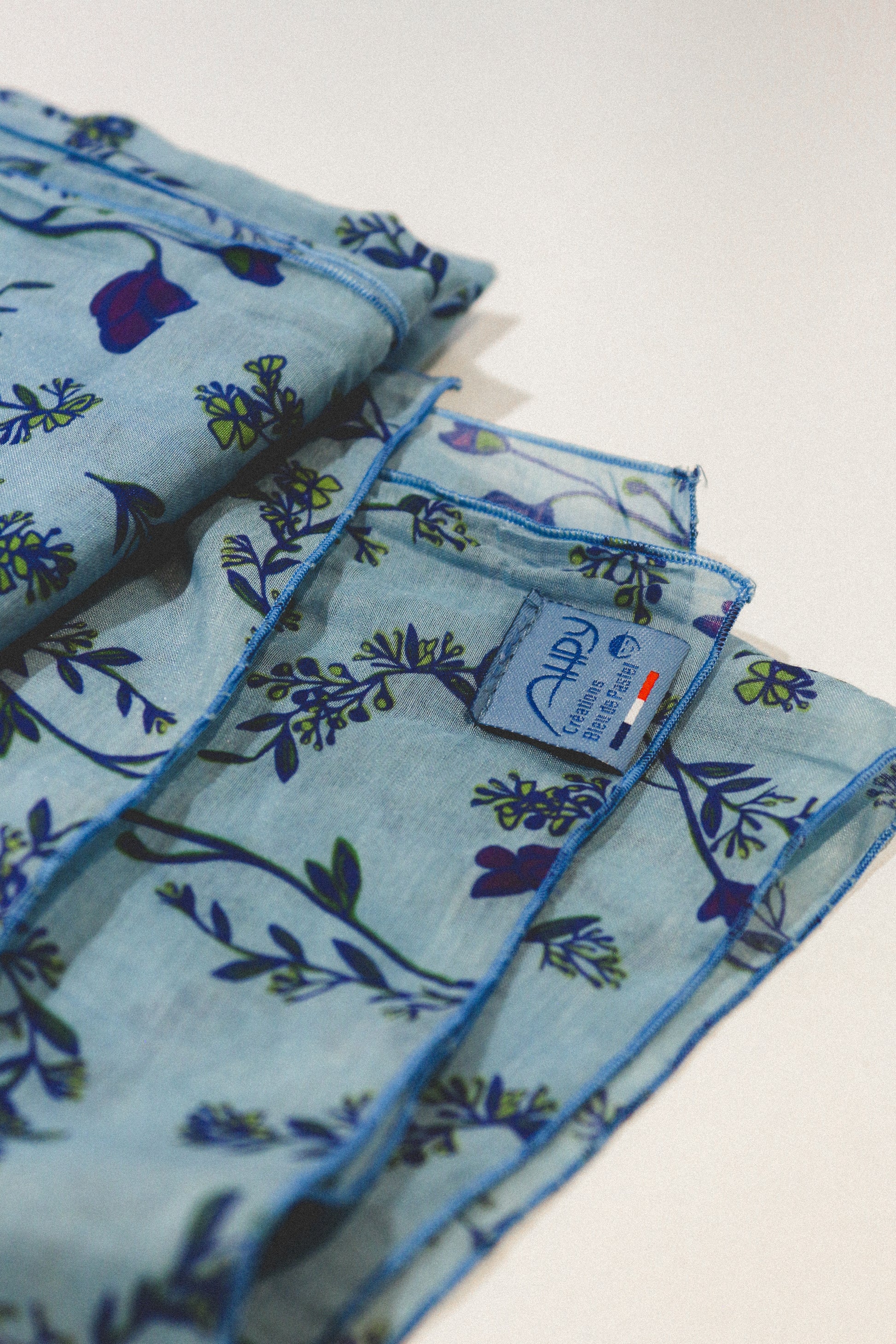 Carré en voile coton et soie, « Le fichu Audrey Pastel & Violette », une version plus petite du carré qui revient en vogue...